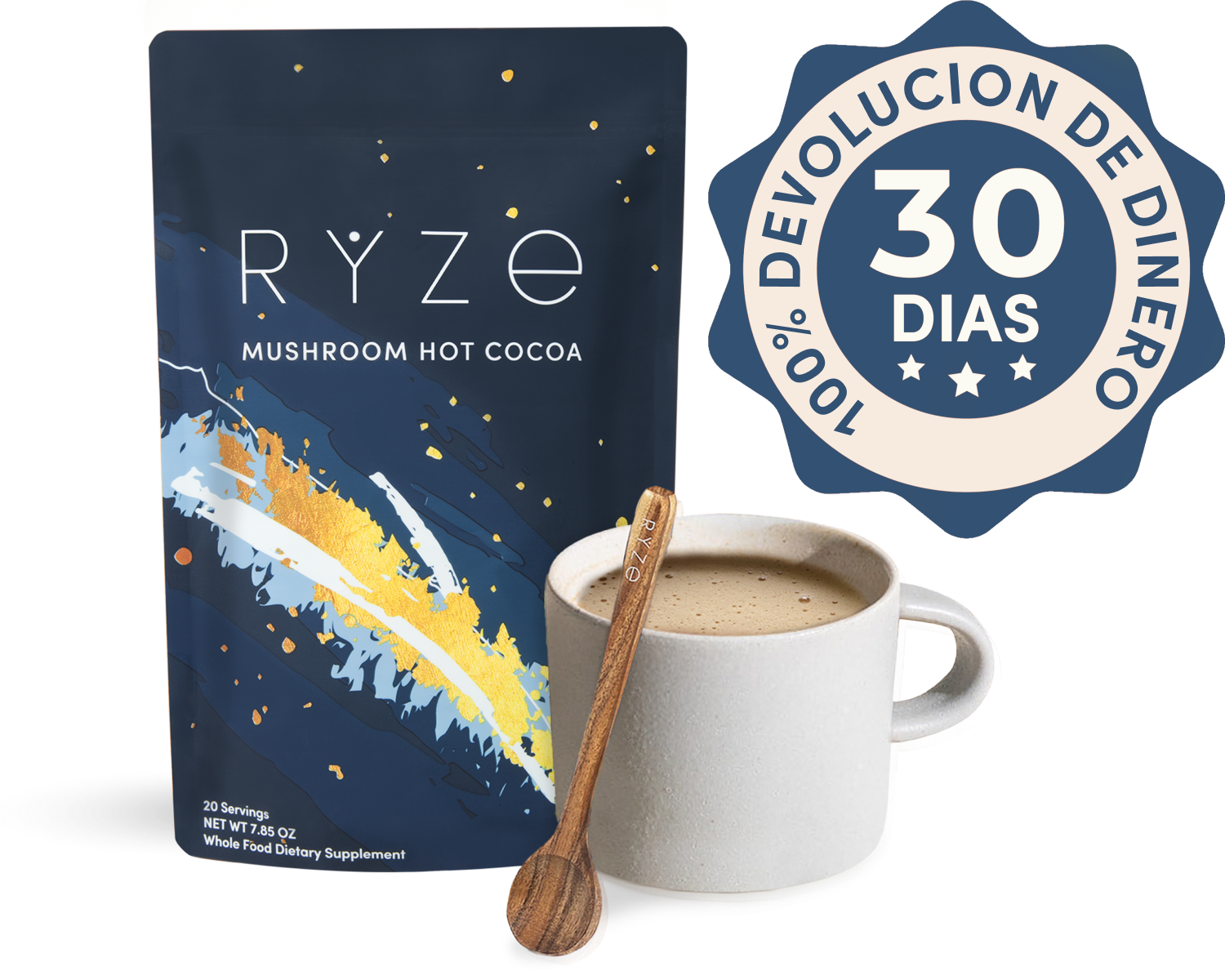 RYZE mushroom hot cocoa package with a mug and 30-day guarantee badge.