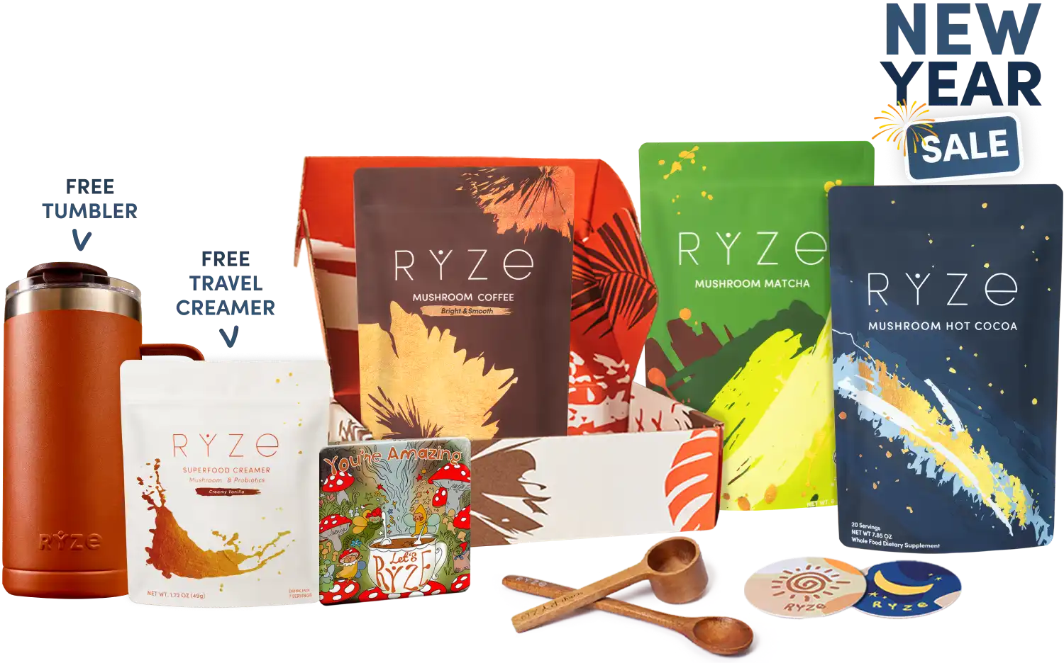 Mushroom hot cocoa, acacia spoon and scoop, coasters, and mushroom magnet with text labels.