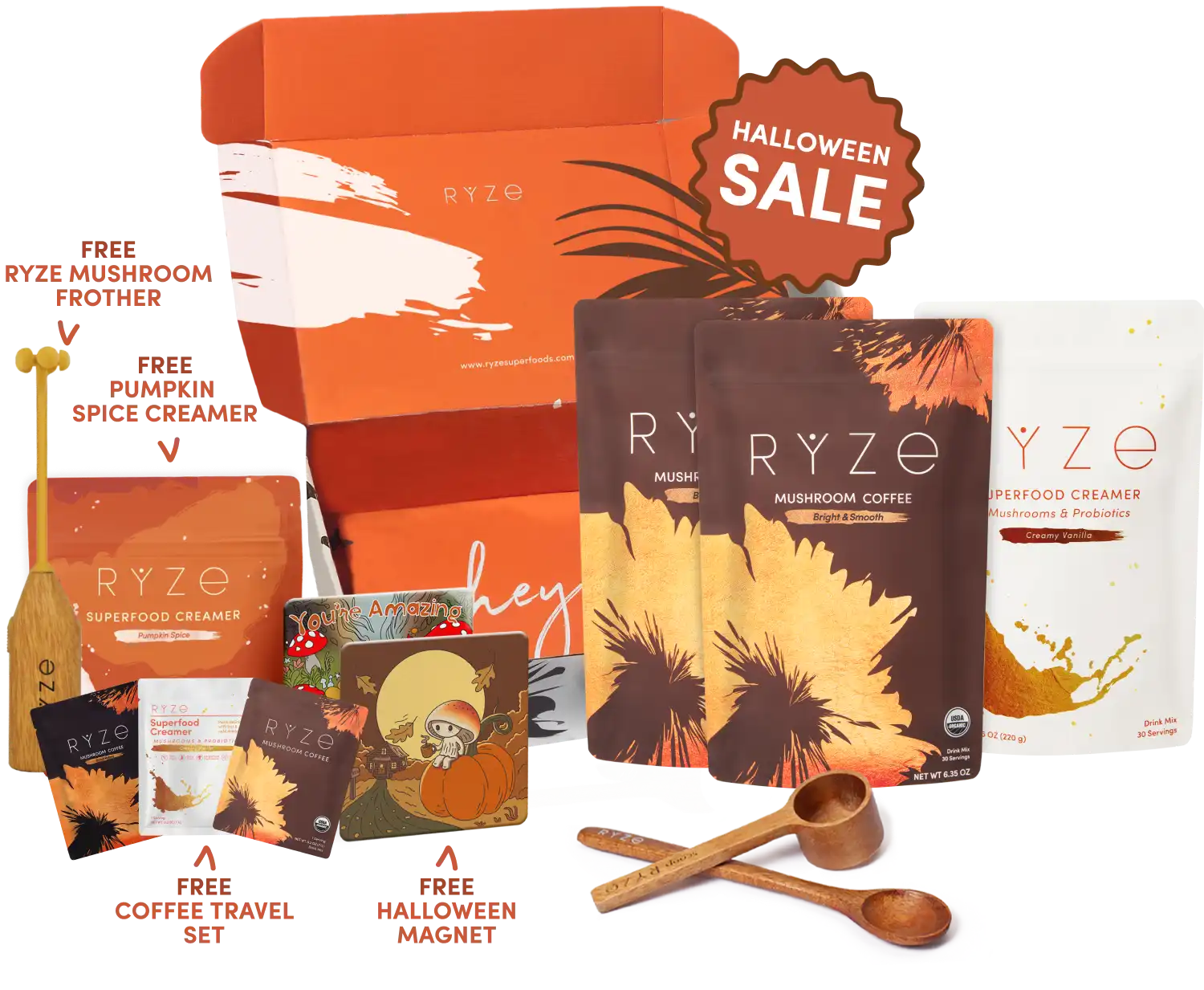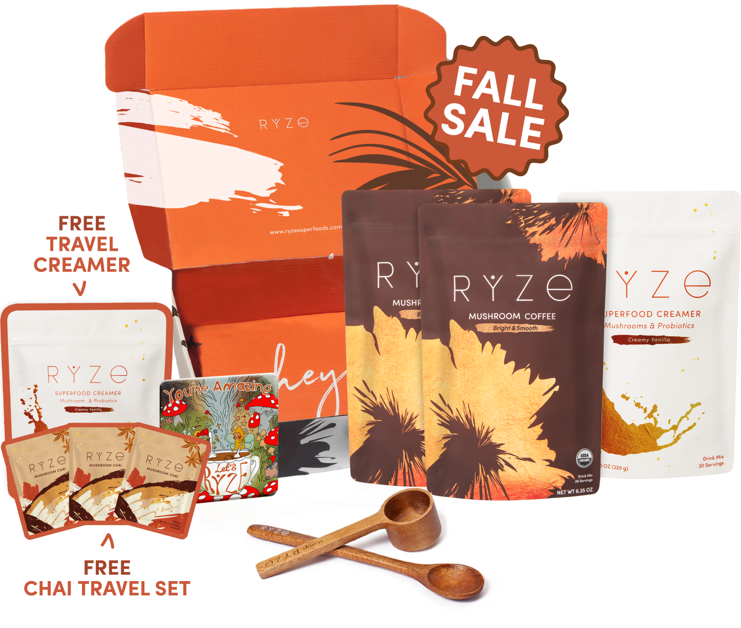 Collection of Ryze products including hot cocoa, wooden utensils, coasters, and a mushroom-themed magnet.