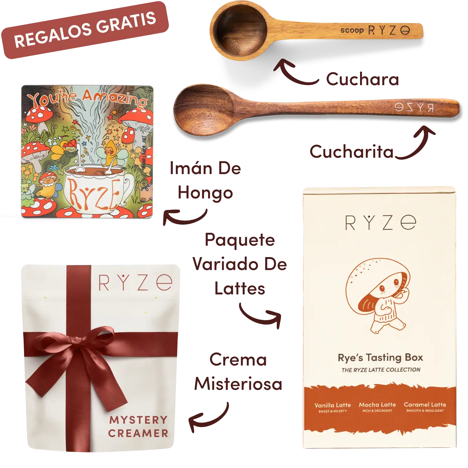 Mushroom hot cocoa, acacia spoon and scoop, coasters, and mushroom magnet with text labels.