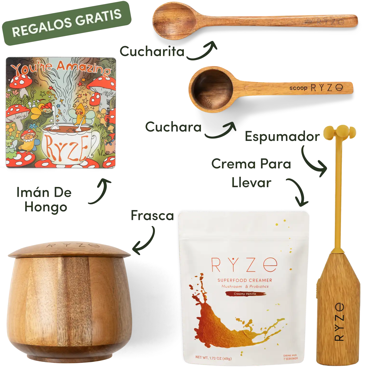 Mushroom hot cocoa, acacia spoon and scoop, coasters, and mushroom magnet with text labels.