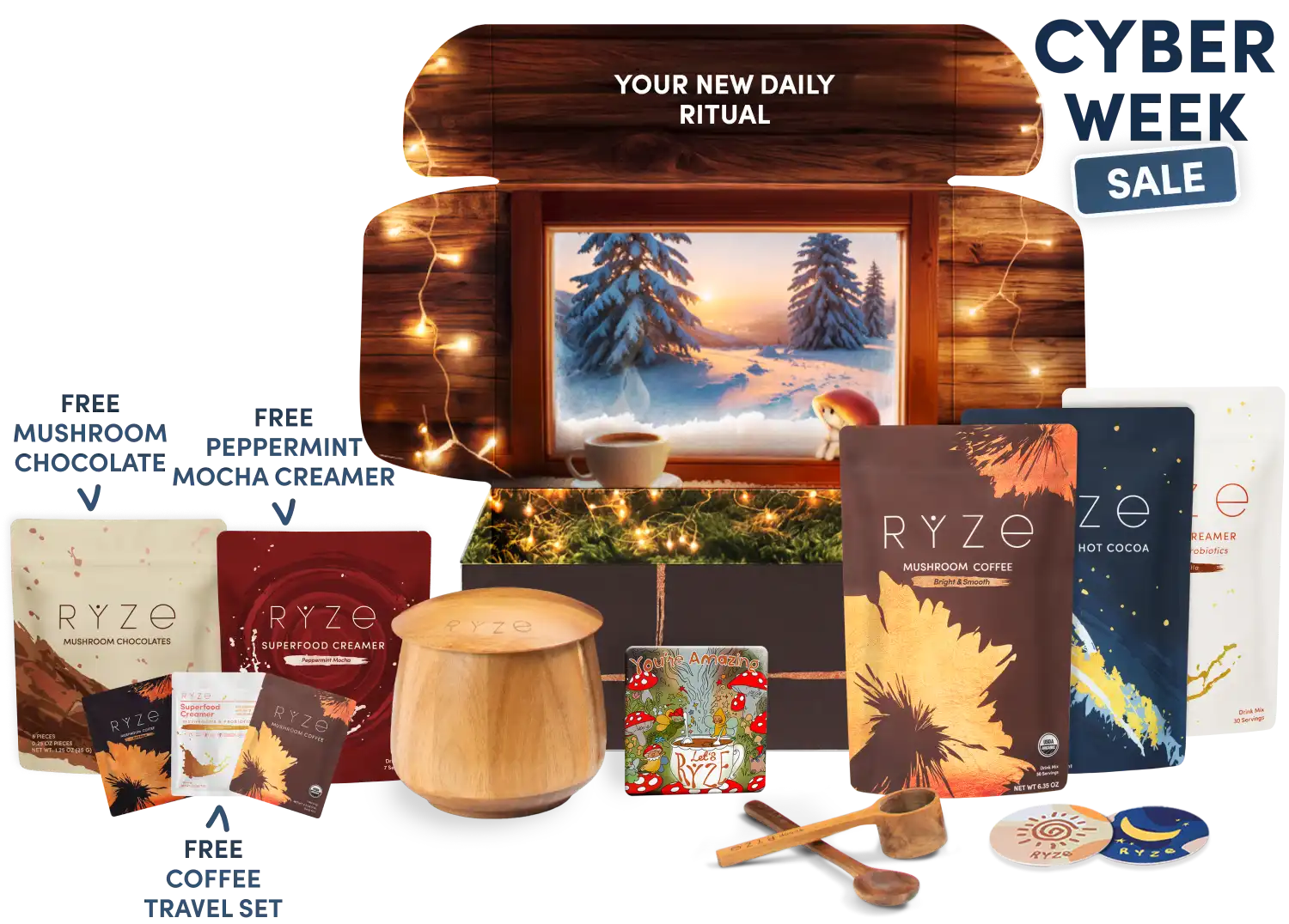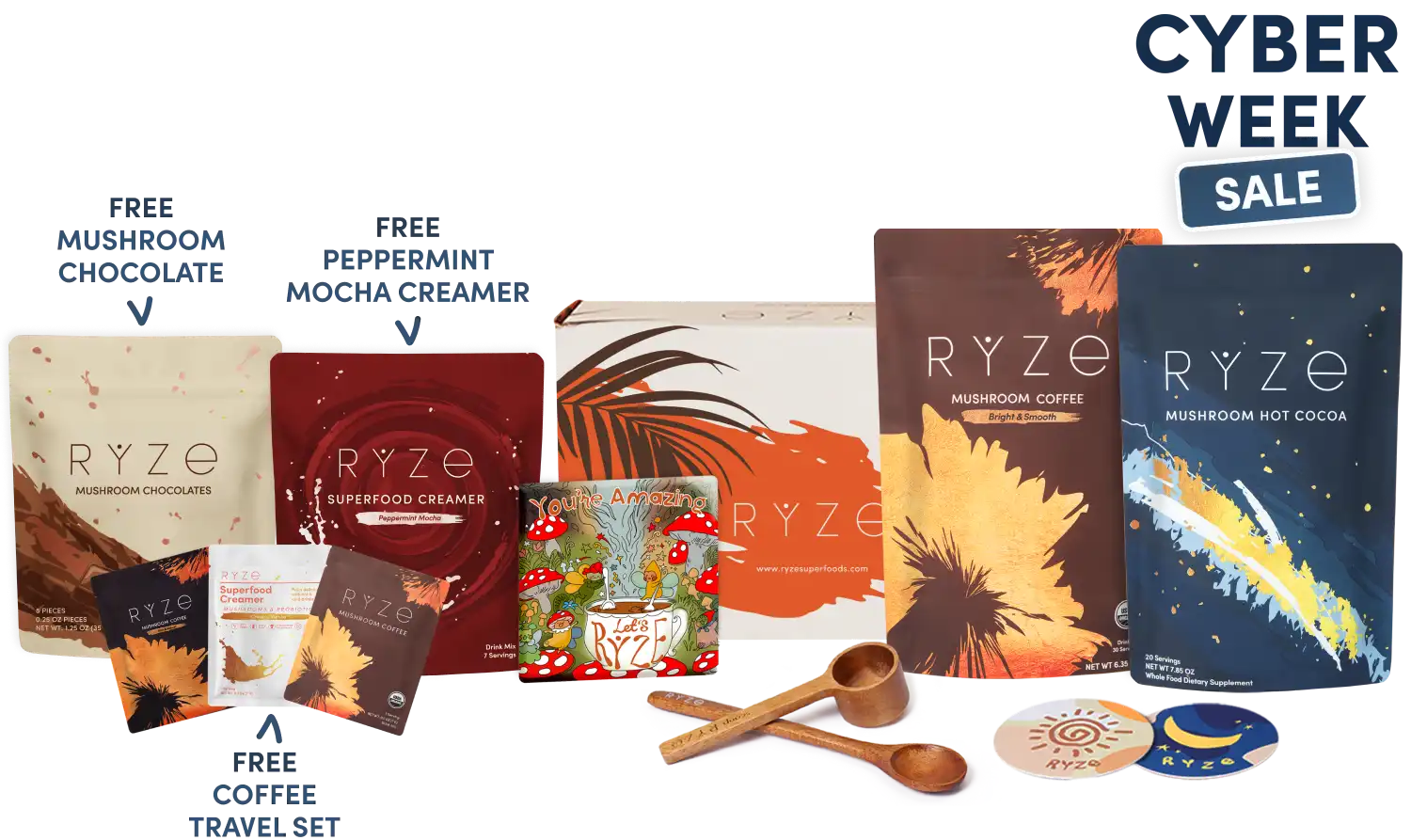 Collection of Ryze products including hot cocoa, wooden utensils, coasters, and a mushroom-themed magnet.