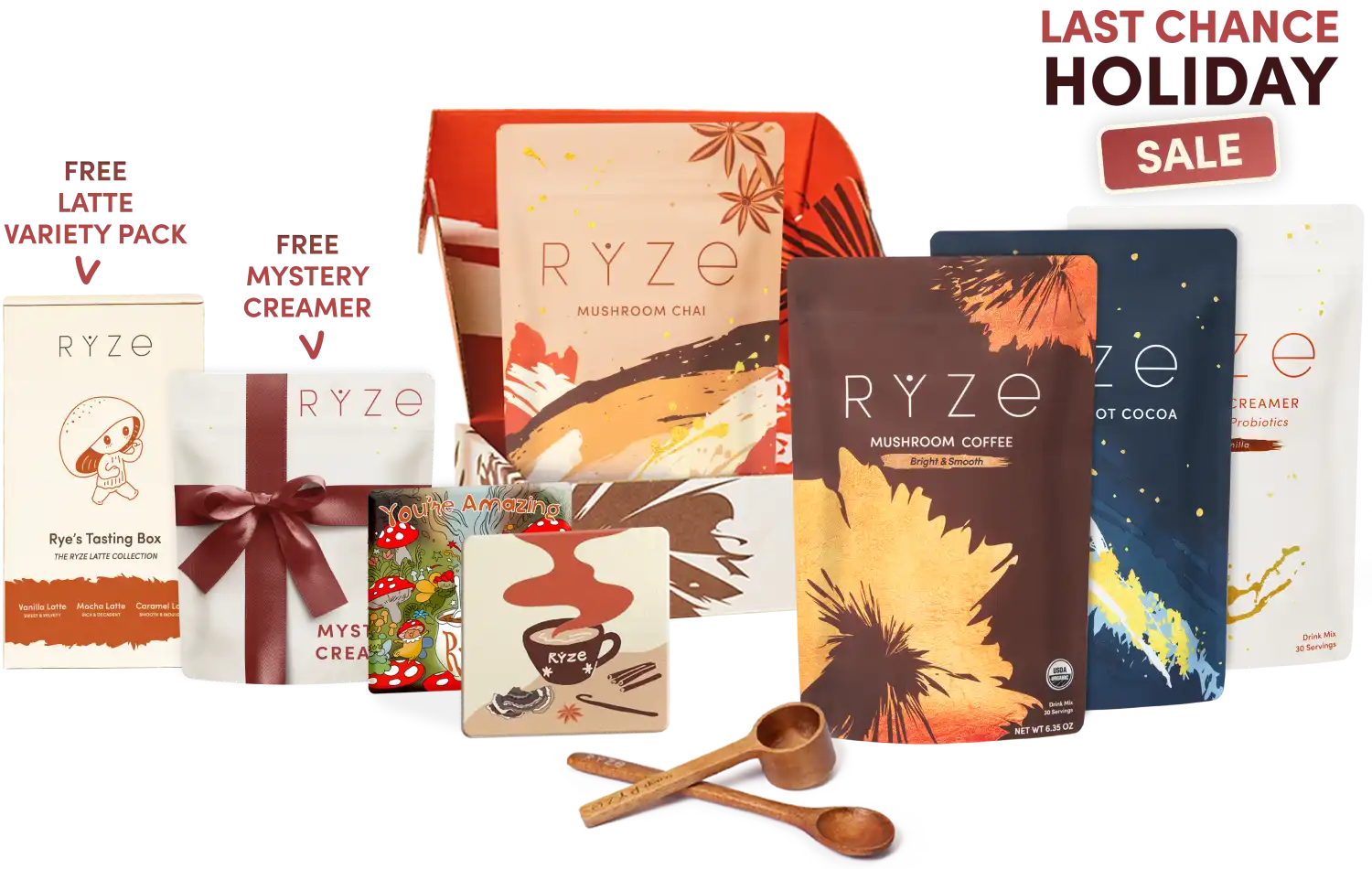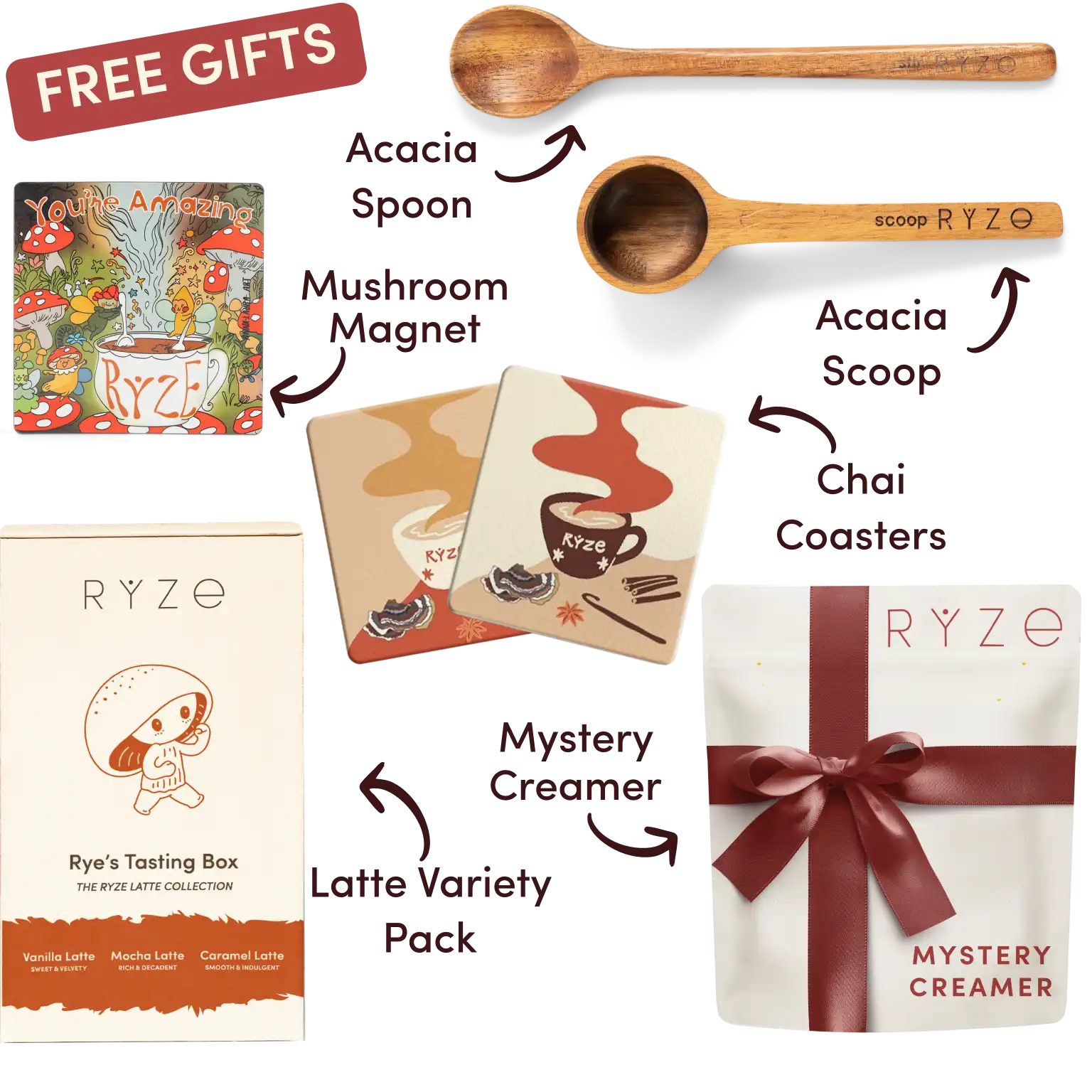 Ingredients: Coconut Milk Powder* (Coconut Milk, Tapioca Maltodextrin, Acacia Fiber), Coconut Water Powder, RYZE Mushroom Blend* (Cordyceps, Reishi, King Trumpet, Shiitake, Turkey Tail, Lion's Mane), Black Tea*, Ginger*, Cinnamon*, Cardamom*, Nutmeg*, Clove*, Vanilla Bean*, Star Anise*, Black Pepper*, *Organic Ingredient.