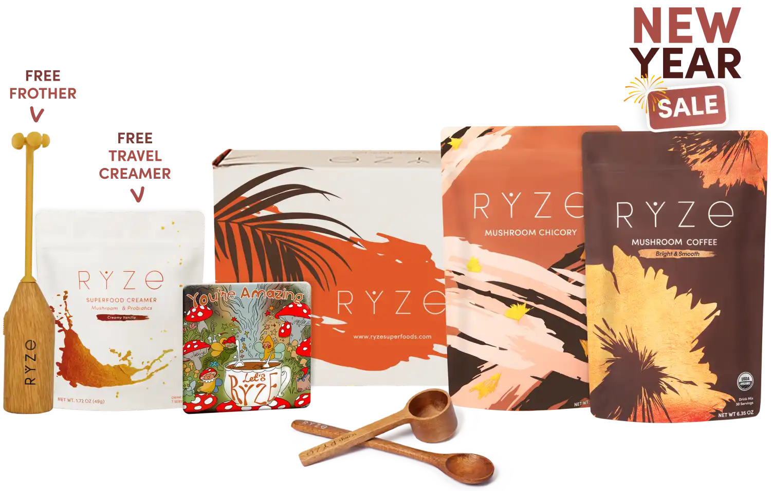 Ingredients: Roasted Chicory Root, RYZE Organic Mushroom Blend (Cordyceps, Lion's Mane, Reishi, Shiitake, Turkey Tail, King Trumpet), Organic Coconut Milk Powder, Organic MCT Oil Powder
