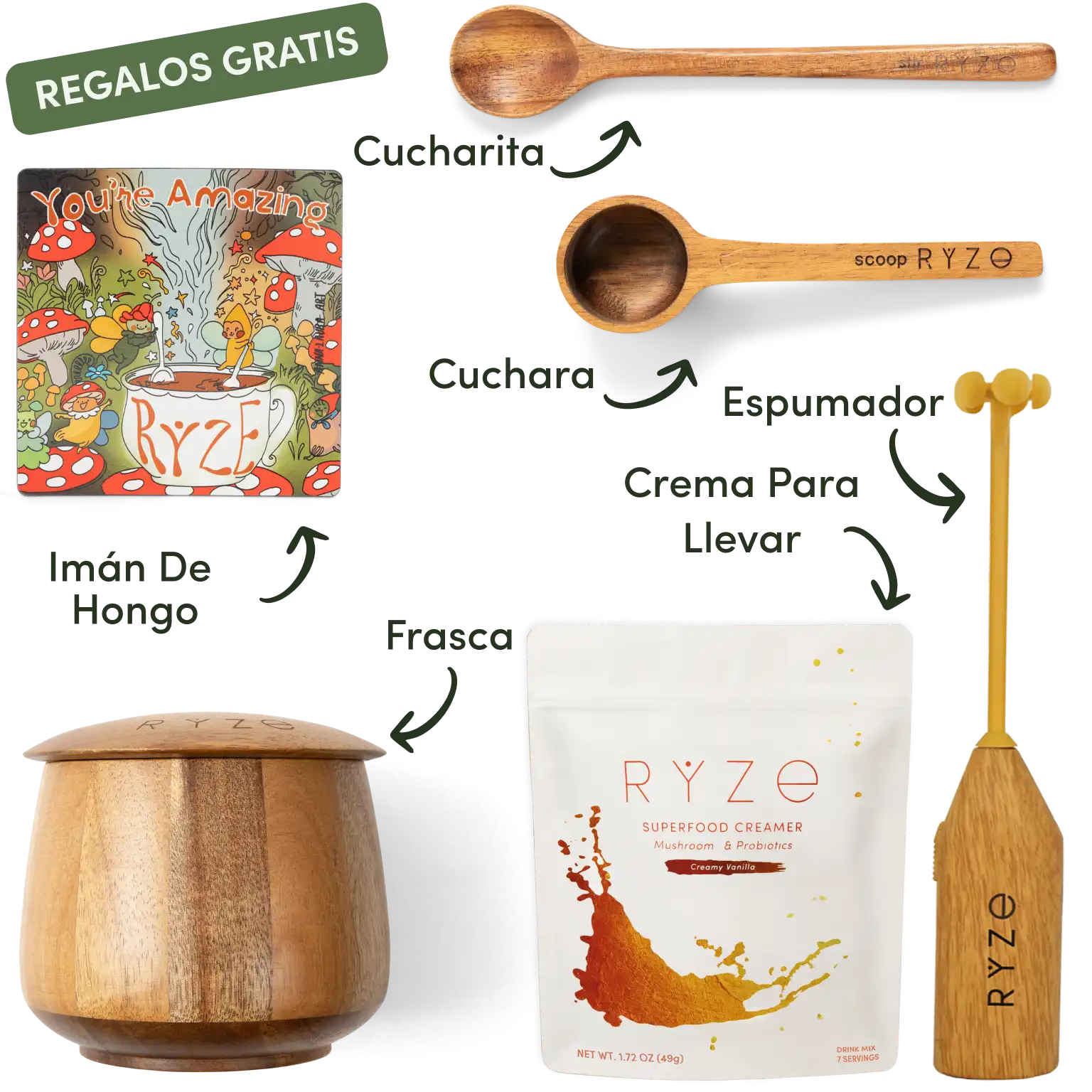 Ingredientes: Matcha japonés orgánico de grado ceremonial, mezcla de hongos RYZE (Cordyceps, Melena de León, Reishi, Shiitake, Cola de Pavo, Trompeta Real), polvo de leche de coco, polvo de aceite MCT, espirulina azul, sal rosa del Himalaya.