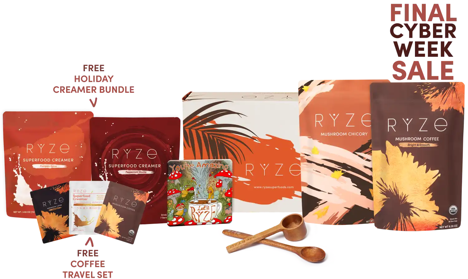 Ingredients: Roasted Chicory Root, RYZE Organic Mushroom Blend (Cordyceps, Lion's Mane, Reishi, Shiitake, Turkey Tail, King Trumpet), Organic Coconut Milk Powder, Organic MCT Oil Powder