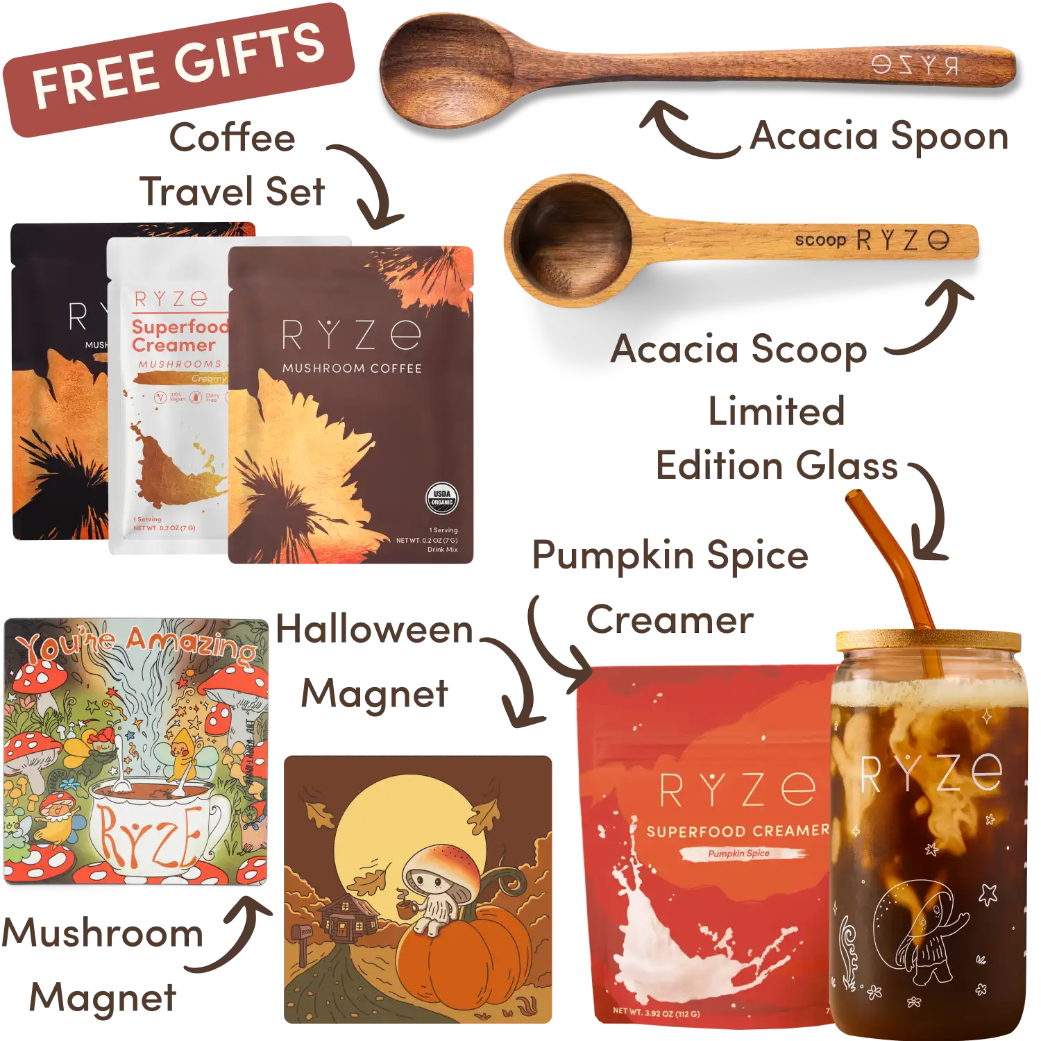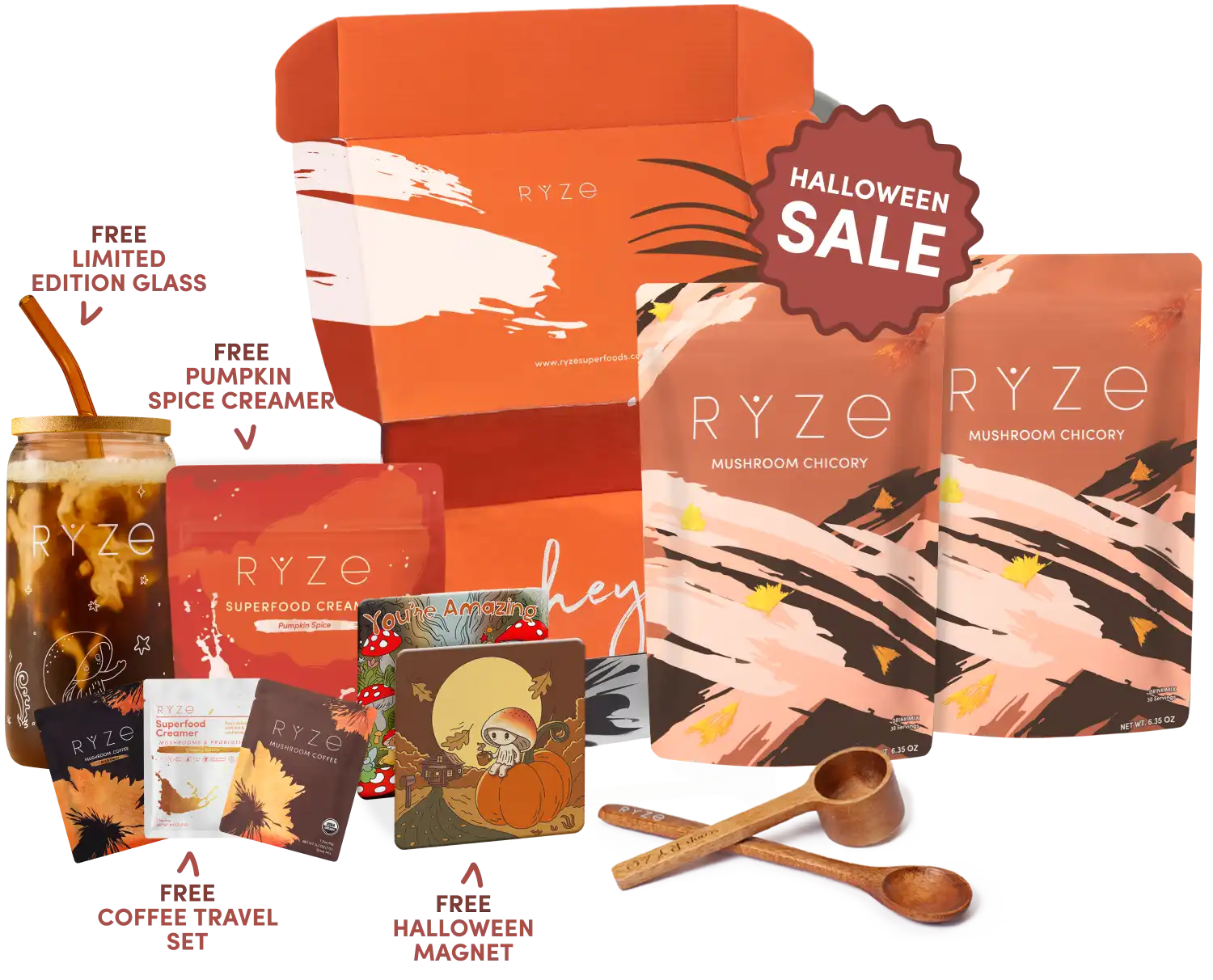 Ingredients: Roasted Chicory Root, RYZE Organic Mushroom Blend (Cordyceps, Lion's Mane, Reishi, Shiitake, Turkey Tail, King Trumpet), Organic Coconut Milk Powder, Organic MCT Oil Powder