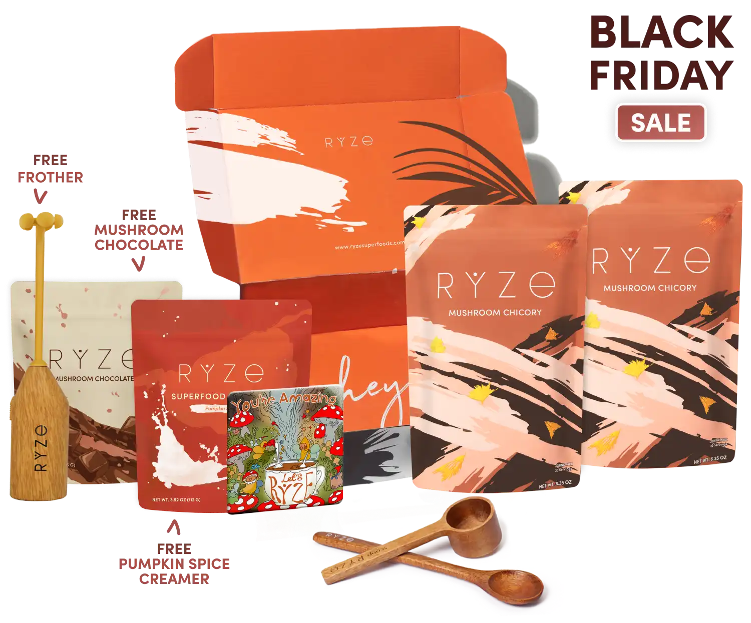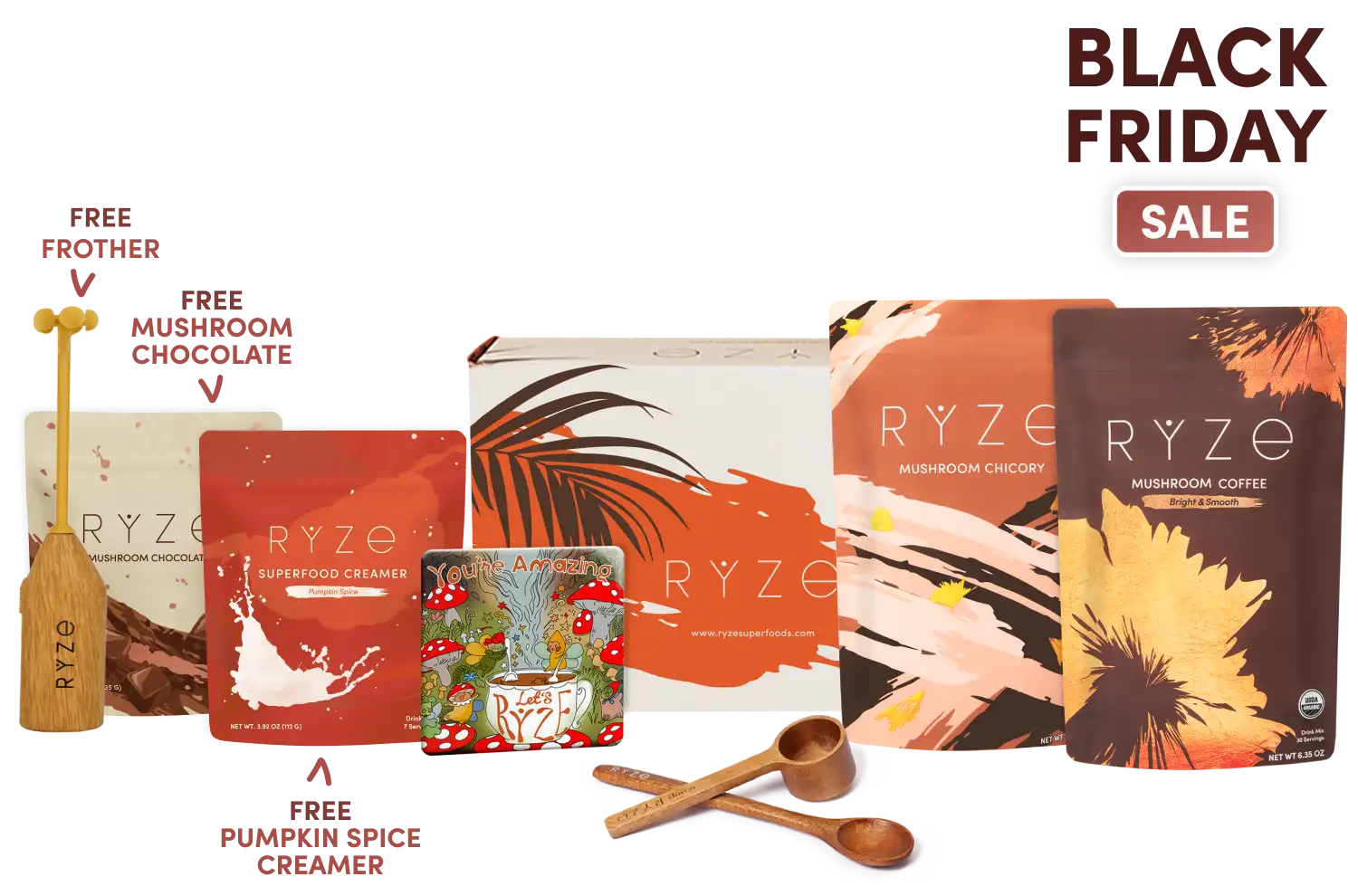 Ingredients: Roasted Chicory Root, RYZE Organic Mushroom Blend (Cordyceps, Lion's Mane, Reishi, Shiitake, Turkey Tail, King Trumpet), Organic Coconut Milk Powder, Organic MCT Oil Powder
