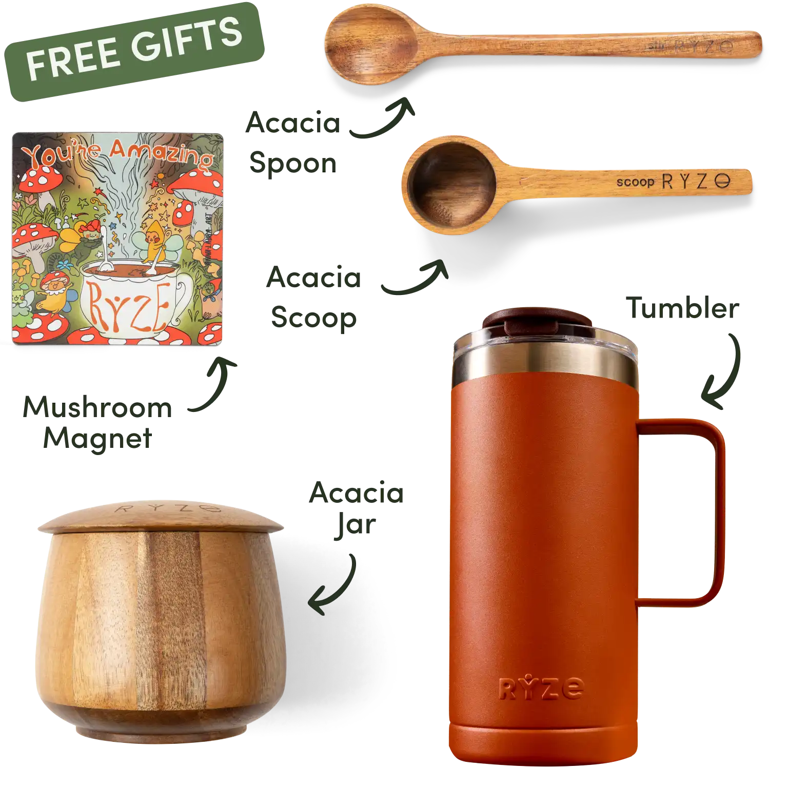 Mushroom hot cocoa, acacia spoon and scoop, coasters, and mushroom magnet with text labels.