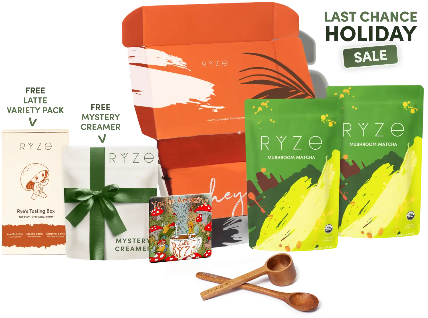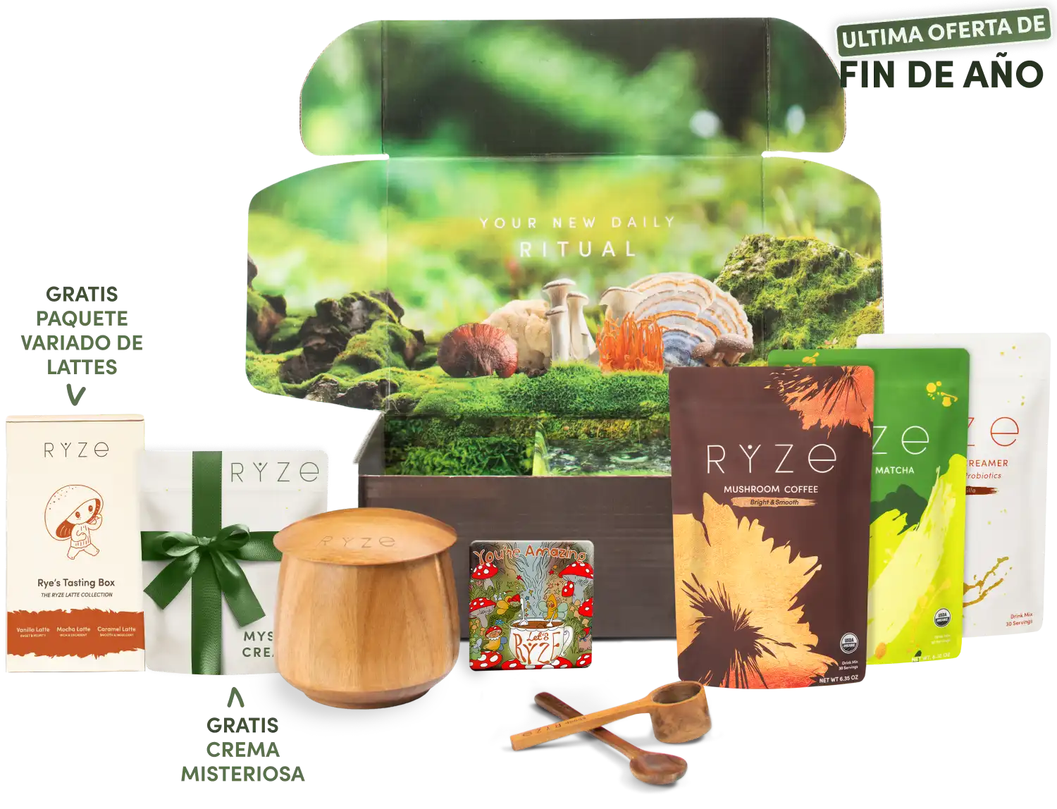Ingredientes: Matcha japonés orgánico de grado ceremonial, mezcla de hongos RYZE (Cordyceps, Melena de León, Reishi, Shiitake, Cola de Pavo, Trompeta Real), polvo de leche de coco, polvo de aceite MCT, espirulina azul, sal rosa del Himalaya.