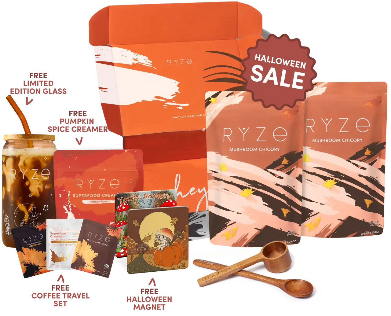 Mushroom Coffee (30 Servings) Mushroom Hot Cocoa (20 Servings) FREE Limited Edition Glass FREE Pumpkin Spice Creamer FREE Travel Set FREE Spoon + Scoop 30-Day Money Guarantee