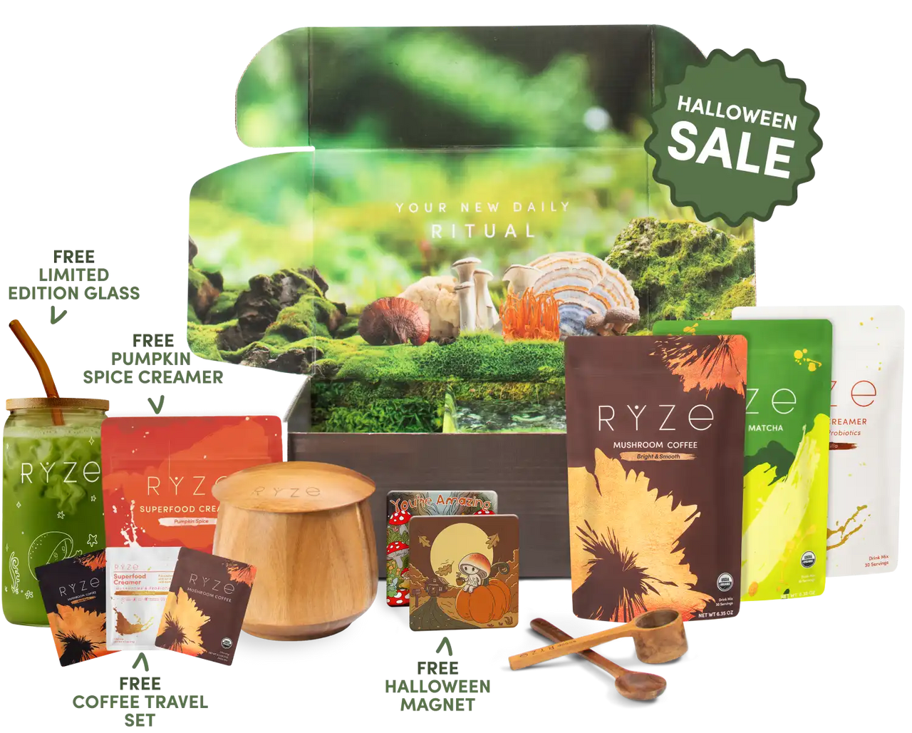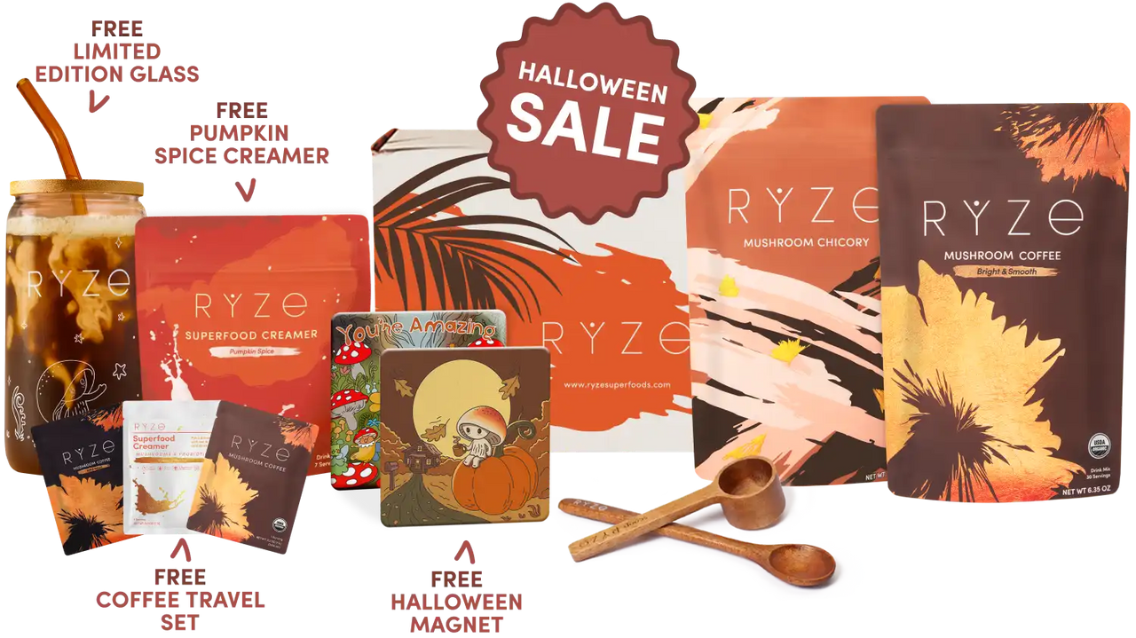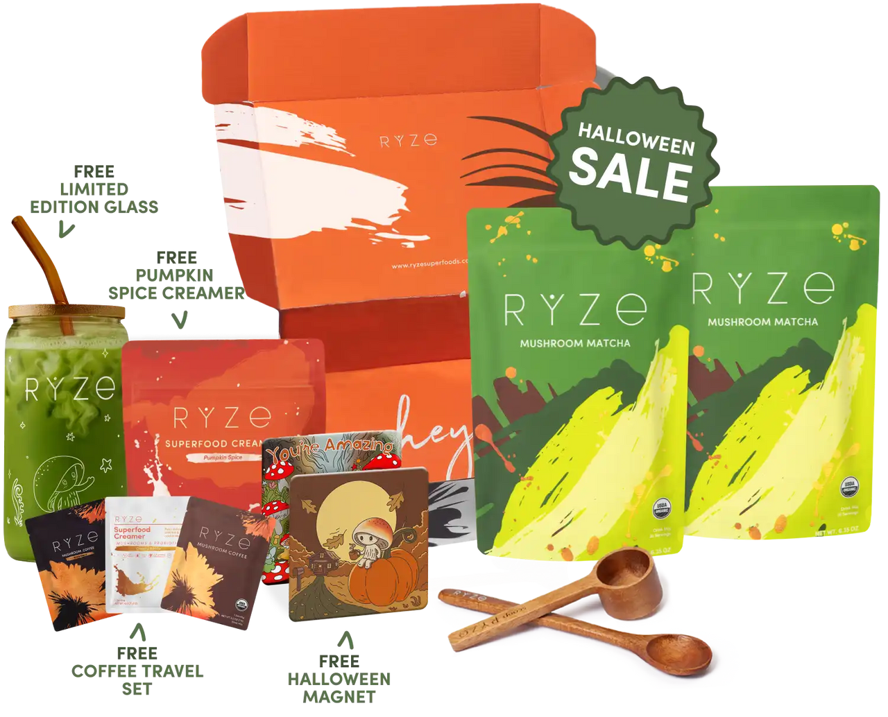 RYZE Mushroom Coffee (30 Servings) RYZE Mushroom Matcha (30 Servings) RYZE Mushroom Chai (20 Servings) RYZE Superfood Creamer (First Order)