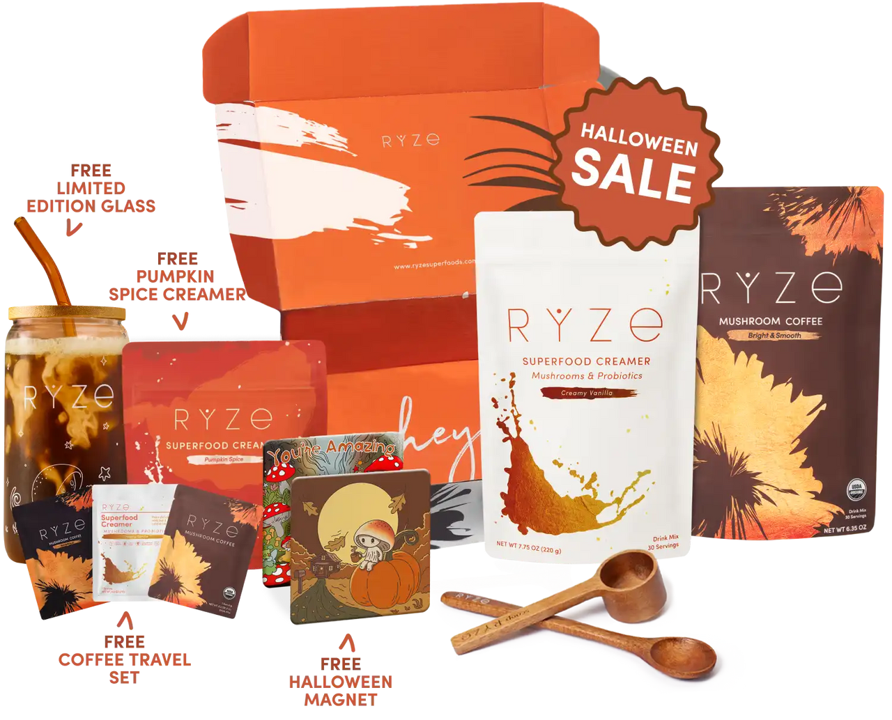 2x Mushroom Coffee (60 Servings) 1x Superfood Creamer (30 servings) FREE Limited Edition Glass FREE Pumpkin Spice Creamer FREE Travel Set Ritual Kit: Jar, Spoon + Scoop