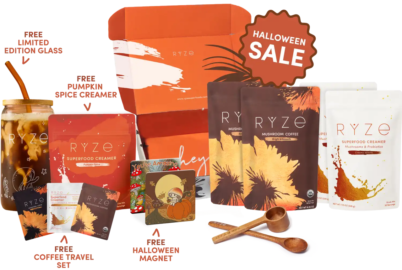 Mushroom Coffee (2x) FREE Limited Edition Glass FREE Pumpkin Spice Creamer FREE Travel Set FREE Spoon + Scoop 30-Day Money Guarantee