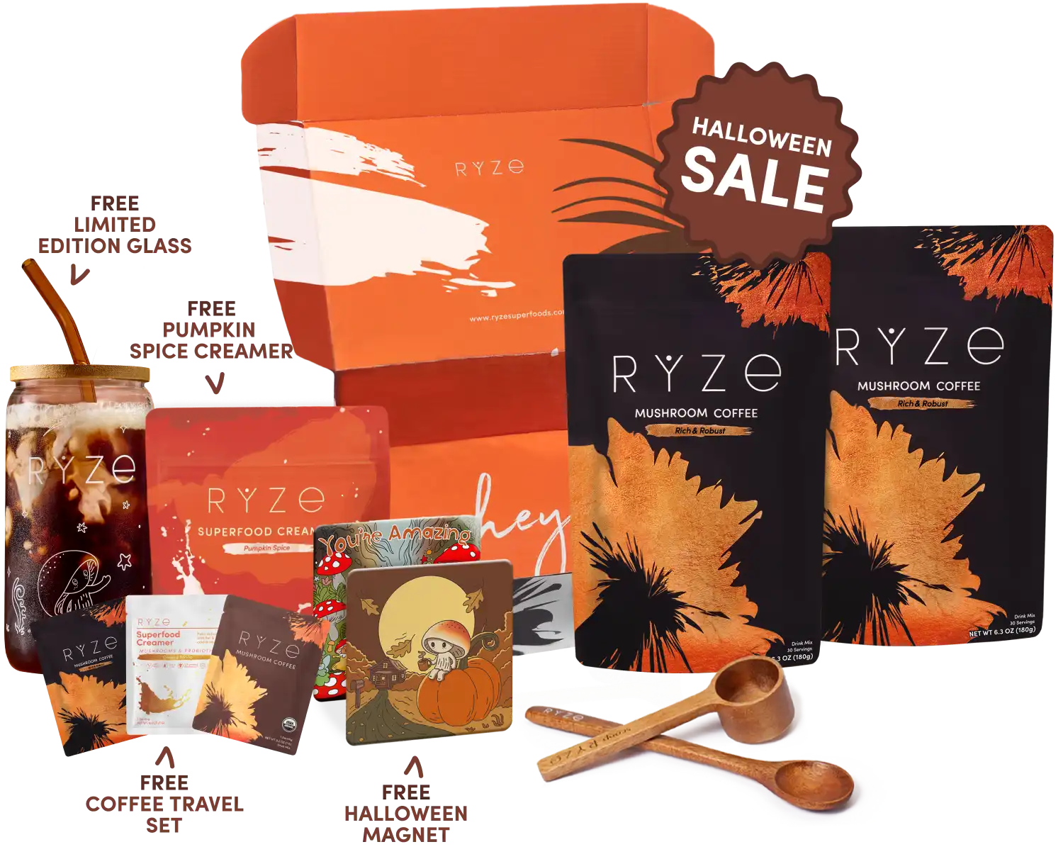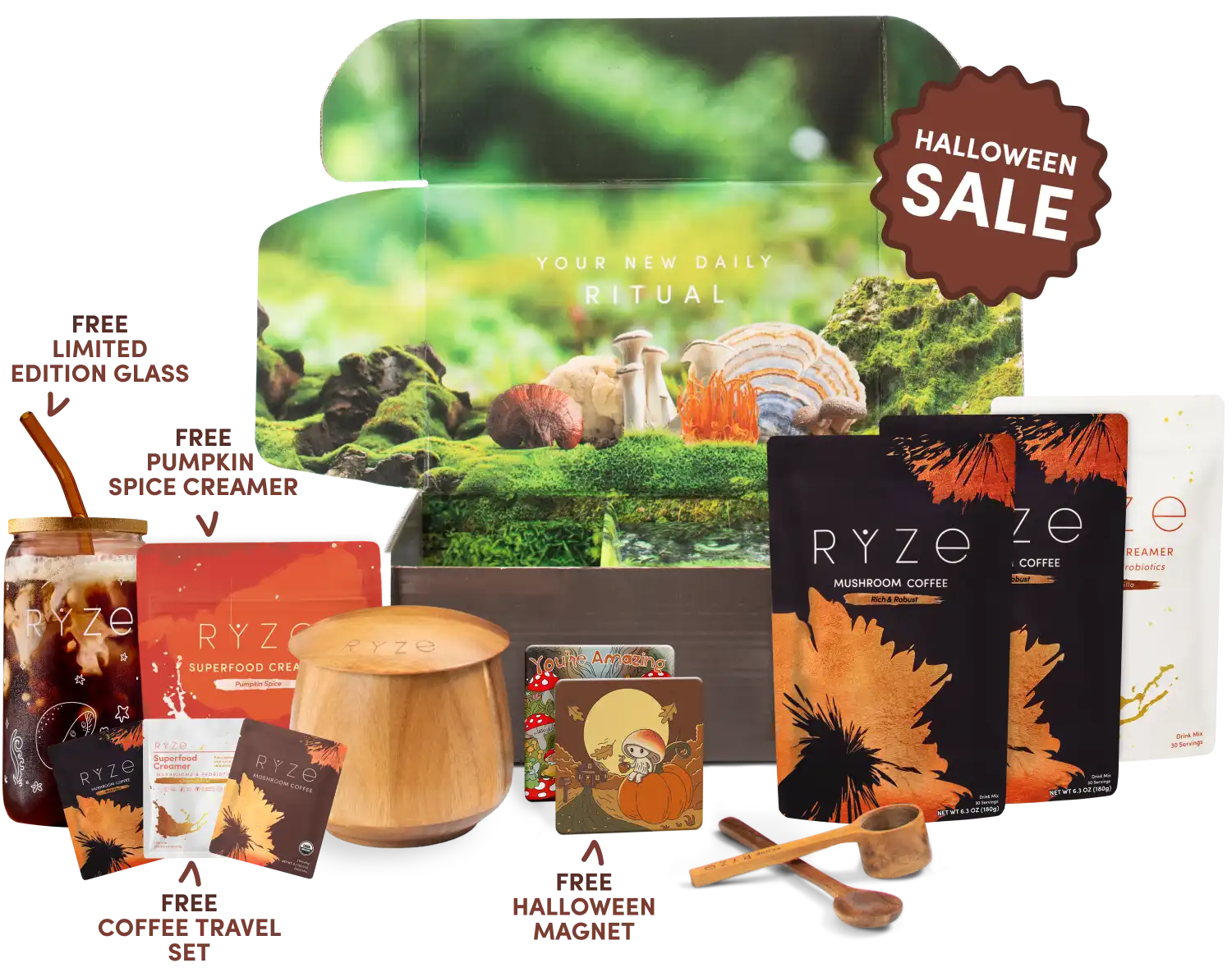 Ingredients: Instant Coffee, RYZE SUPER6™ Mushroom Blend (Cordyceps, Lion’s Mane, Reishi, Shiitake, Turkey Tail, King Trumpet), Prebiotic Blend (Acacia Fiber, Inulin Fiber, Tapioca Fiber)
