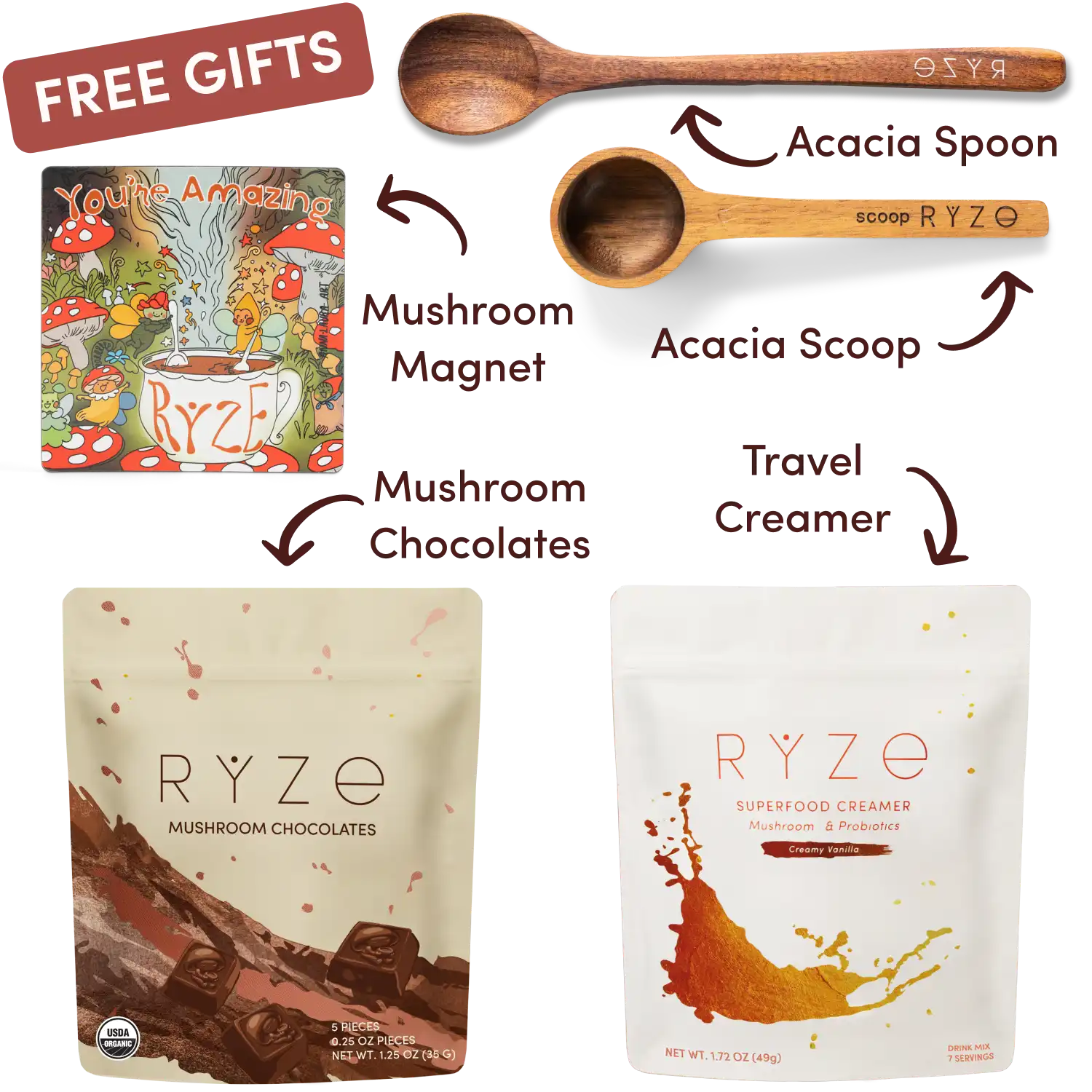 Ingredients: Roasted Chicory Root, RYZE Organic Mushroom Blend (Cordyceps, Lion's Mane, Reishi, Shiitake, Turkey Tail, King Trumpet), Organic Coconut Milk Powder, Organic MCT Oil Powder