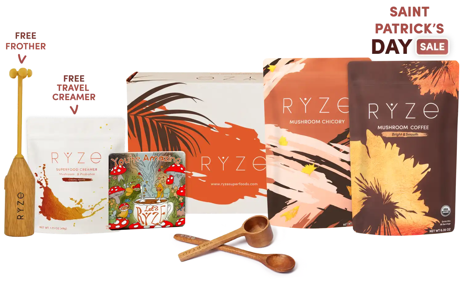 Ingredients: Roasted Chicory Root, RYZE Organic Mushroom Blend (Cordyceps, Lion's Mane, Reishi, Shiitake, Turkey Tail, King Trumpet), Organic Coconut Milk Powder, Organic MCT Oil Powder
